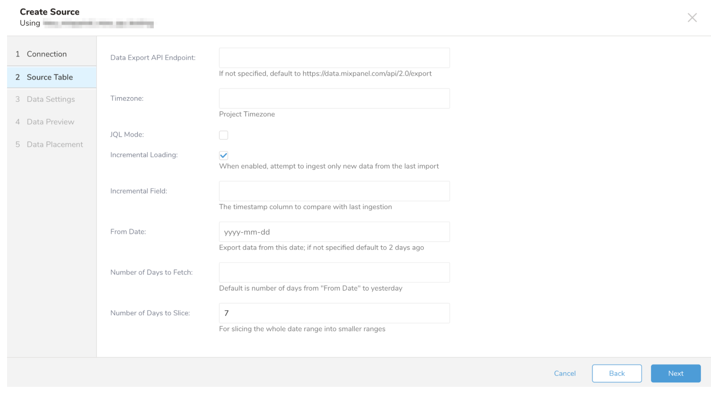 | Backfill Days | The amount of time that will be subtracted from from\_date to calculate the final from\_date that is used for the API Request. This is due to the Mixpanel caching data on user devices before sending it to the Mixpanel server. It only affects when Incremental is true and Incremental Field is specified. The default value is 5 |
