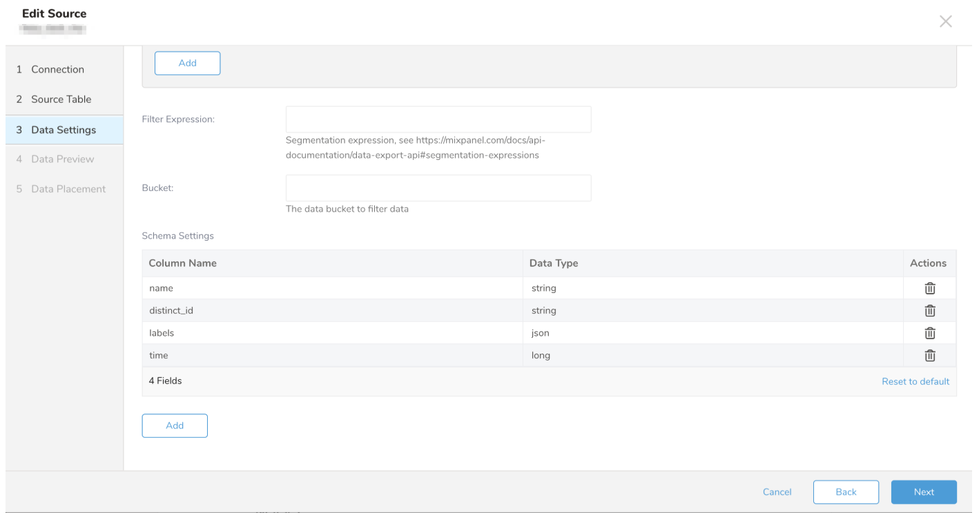 | Incremental Column Upper Limit Delay In Seconds | The upper limit of the incremental column. When using export with the incremental column, the plugin will lock the upper limit of the incremental column query with the job start time. This is to support when Mixpanel has a delay in their processing. It only affects Export endpoint. The default value is 0. |