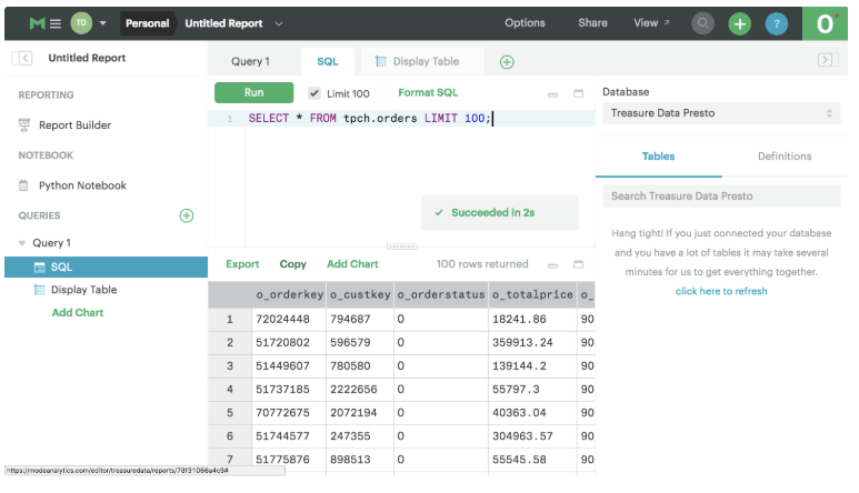 You can run queries in Mode Analytics and send reports generated from the queries to Treasure Data.
