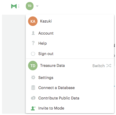 Connect to Treasure Data from Mode. Click your profile icon button on the menu, and click Connect a Database menu.
