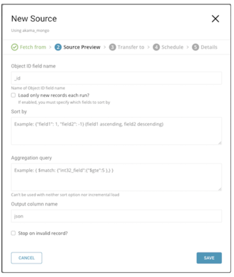 Load only new records each runis checked. - Aggregation query : Query string for aggregation. See also Aggregation — MongoDB Manual and Aggregation Pipeline Stages — MongoDB Manual