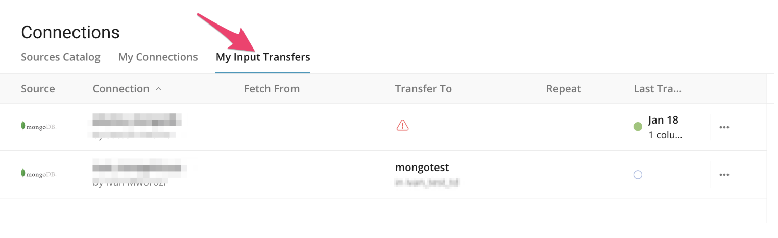 If you need to review the transfer you have just completed for other data connector jobs, you can view a list of your transfers in the My Input Transfers section.