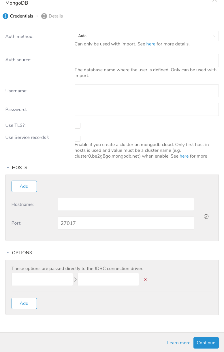 Use Service records?: Enable if you create a cluster on MongoDB cloud. Only the first host in hosts is used and the value must be a cluster name (e.g. cluster0.be2g8go.mongodb.net) when enabling.