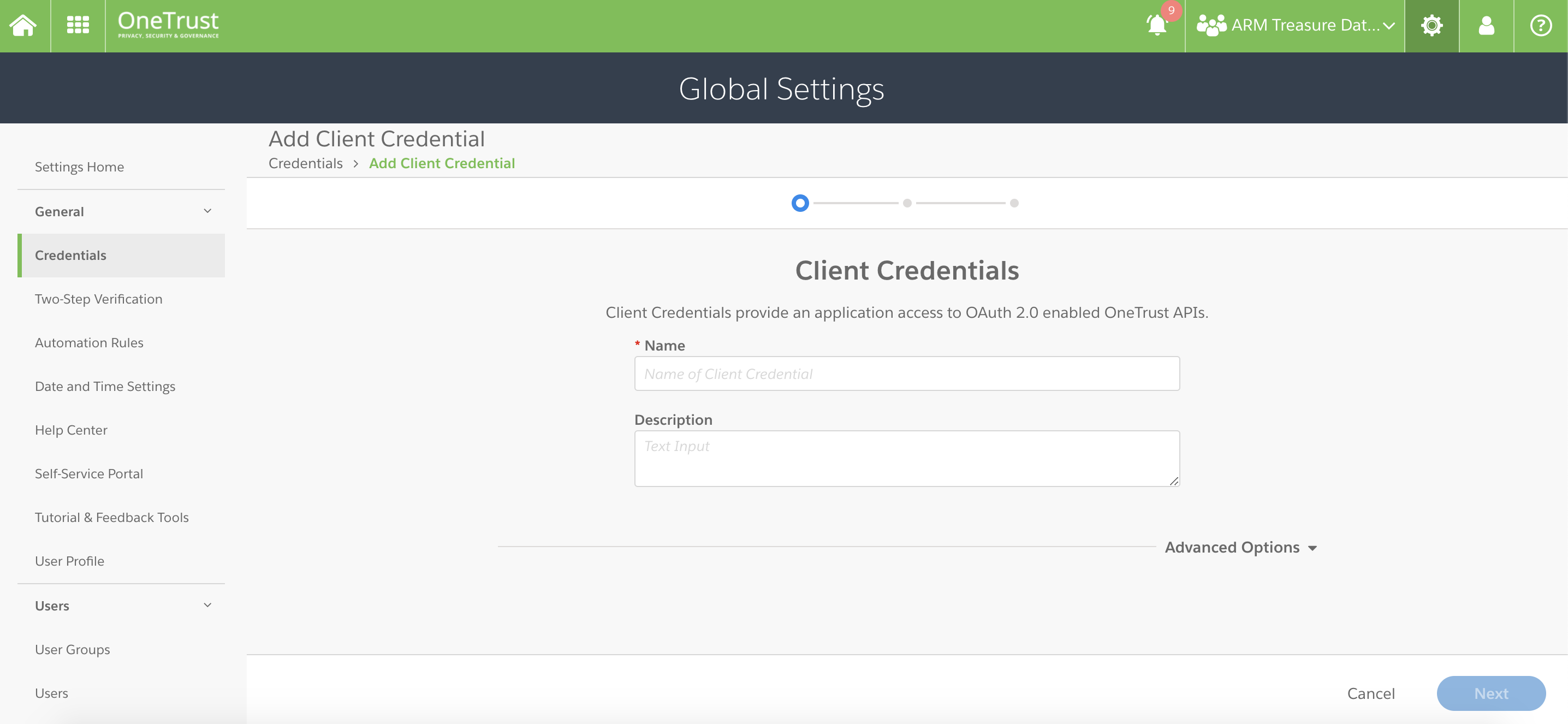 Create a OneTrust token to store the Client ID and Secret. This is short-lived token.
