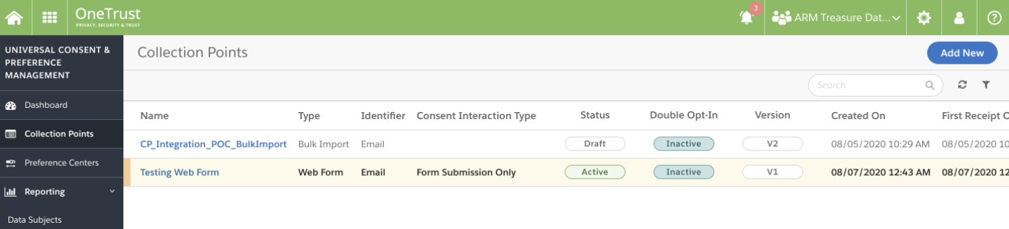 Navigate to https://app.onetrust.com/consent/collection-points. The Collection Point screen displays.