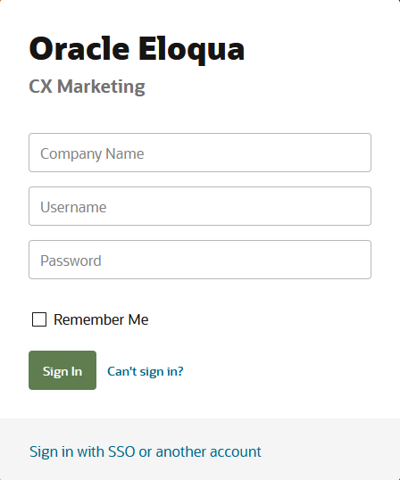 Log in to the Oracle Eloqua Console using the same Company Name, Username, and Password you used when specifying the CSF authentication keys in Oracle JDeveloper and Oracle Enterprise Manager Fusion Middleware Control.