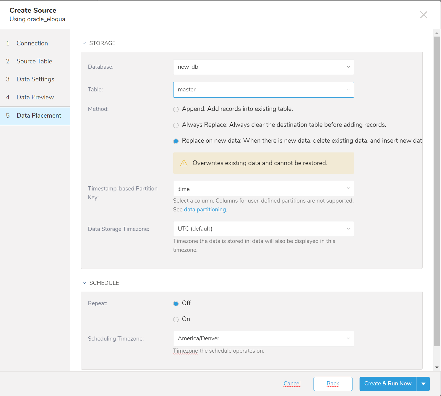 For data placement, select the target database and table where you want your data placed and indicate how often the import should run.