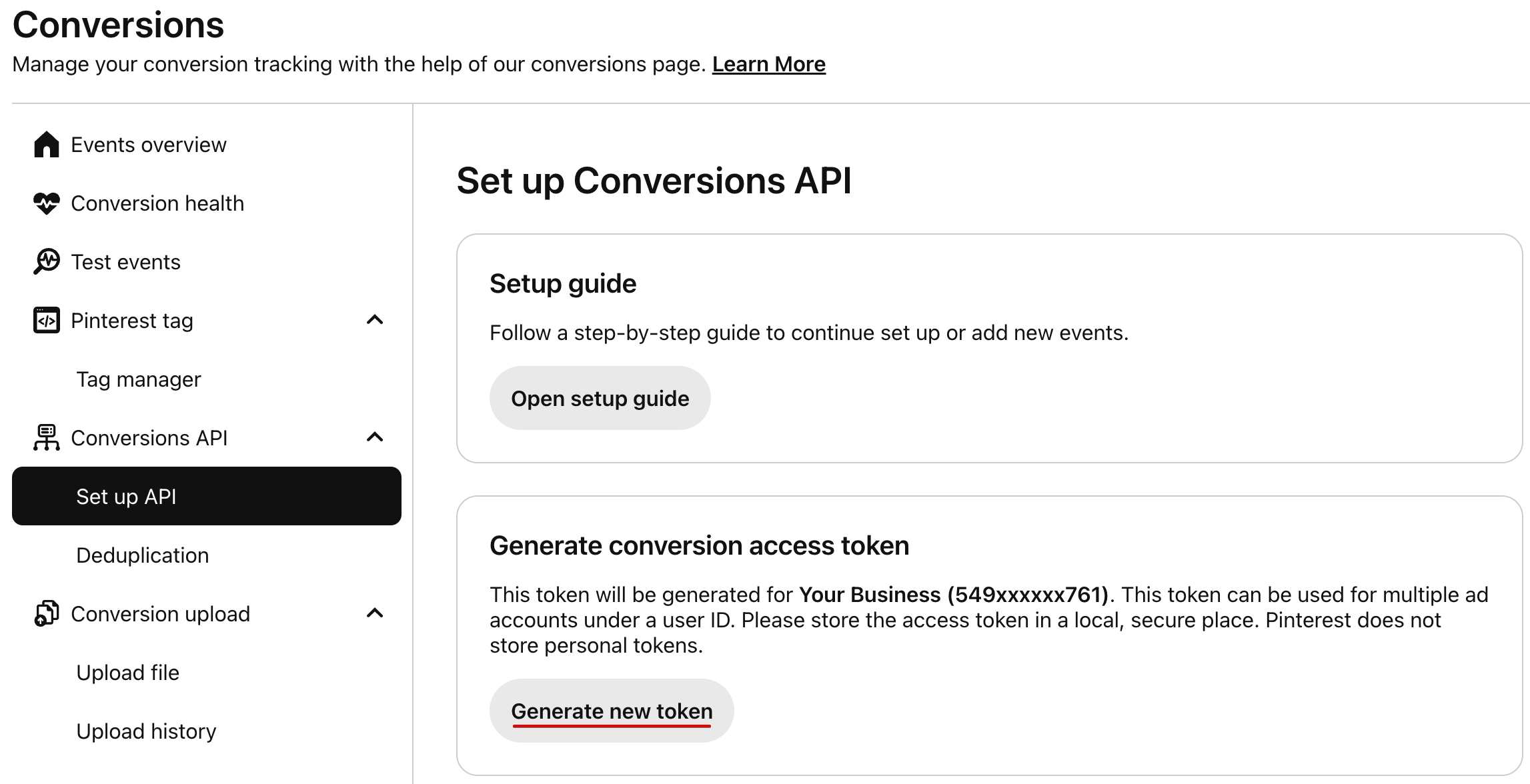 - An access token for the Pinterest Conversion API. See Generate an access token for Pinterest Conversion API.