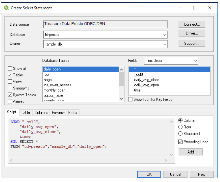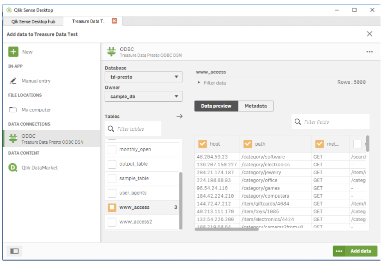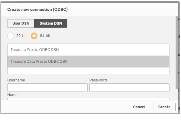 Install the Qlik provided ODBC driver, and register it to your machine. We’ll assume you have DSN (Data Source Name) as Treasure Data Presto in the following sections.