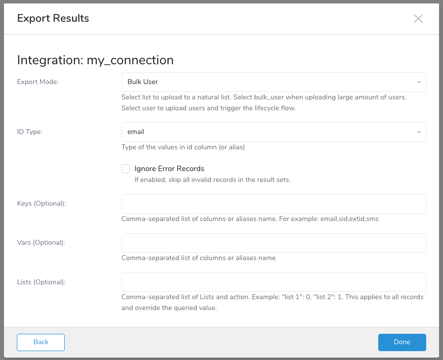 idcolumn --email, sms, sid, extid.Optionally, If Ignore Error Records selected, export jobs will still proceed even if a user cannot be created/updated. If left unchecked, TreasureData-side jobs terminate if an error record occurs. Submitted (Sailthru-side) jobs cannot rollback. Notes that unlike User export mode, “Ignore Error Records” is meant only for some client-side validation (for example, the malformed syntax of Lists or Vars). Other kinds of invalid records will be automatically ignored in Sailthru’s jobs by default.