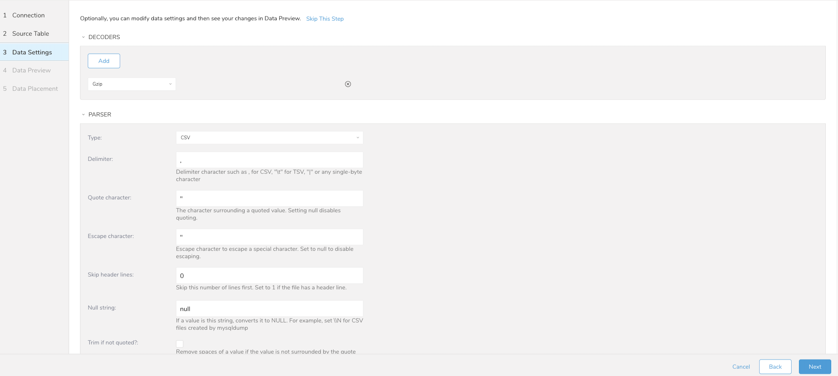 Select Next. Under Storage, you will create a new or select an existing database and create a new or select an existing table for where you want to place the imported data.