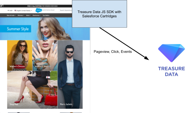 Salesforce Commerce Cloud is one of the industry's most agile and scalable e-commerce platforms. Treasure Data offers a certified Salesforce Commerce Cloud cartridge that enables you to implement Treasure Data JavaScript SDK on your online storefront quickly. The cartridge automatically deploys TD JavaScript SDK tracking across the site, allowing you to collect various types of data, such as the following: