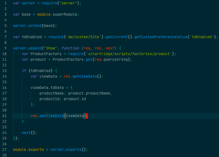 </isscript>You can also add event tracking which will track custom data such as product names and IDs of specific products that a customer views. This requires some custom code in the controllers and a call to the tdTrack.js function.
