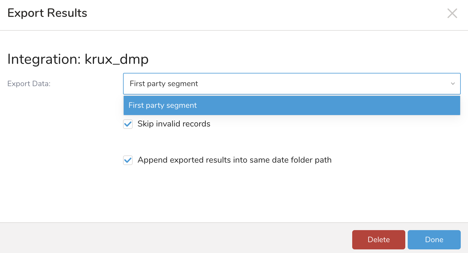 - export_type: Enumeration. Of the different export types, first_party_segment was temporarily supported. Required*.