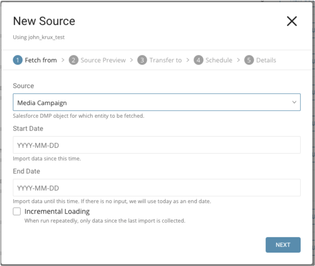 - Start Date: Import data that has been created since this date.