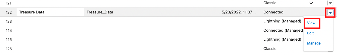 Locate the connected app, click ▼, and then select View.