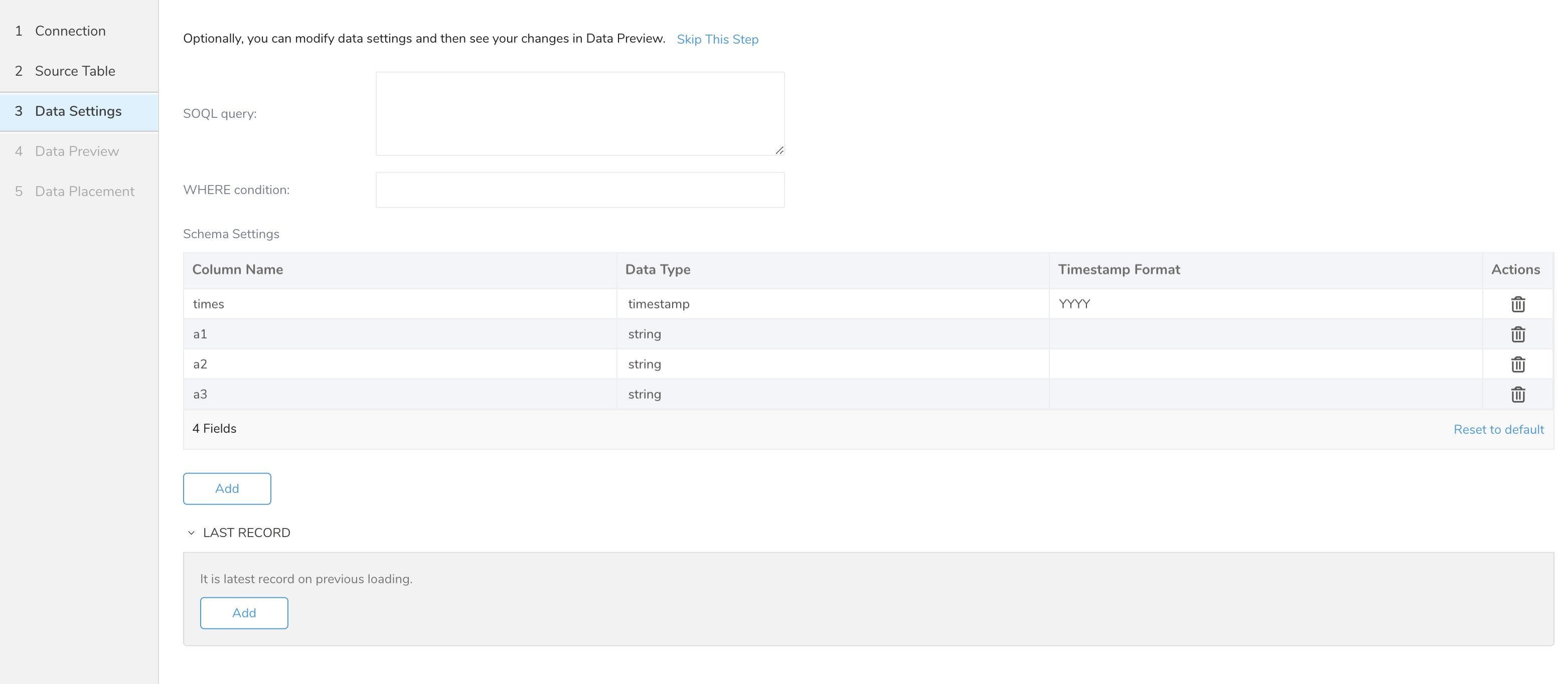 You can edit the SOQL query, WHERE conditions, and Schema settings here.