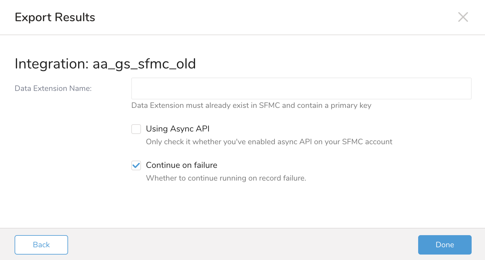 continue_on_failure: falseExample configuration for Asynchronous APIs to upsert data extension using the Legacy package.