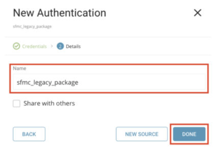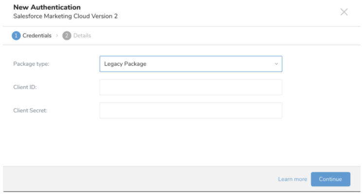 In the New Authentication dialog, select Legacy Package, then enter the Client Id and Client Secret (which you obtained when you created legacy package in SFMC). Select Continue.