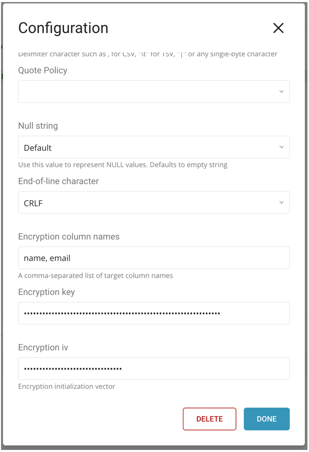 From here, enter your target columns to be encrypted. Key and IV are required to encrypt the columns before sending to SMC SFTP server