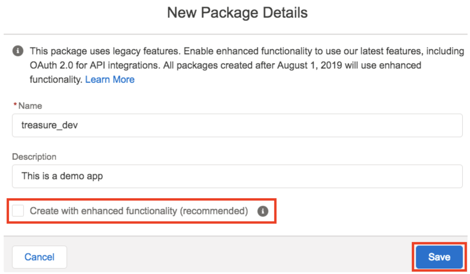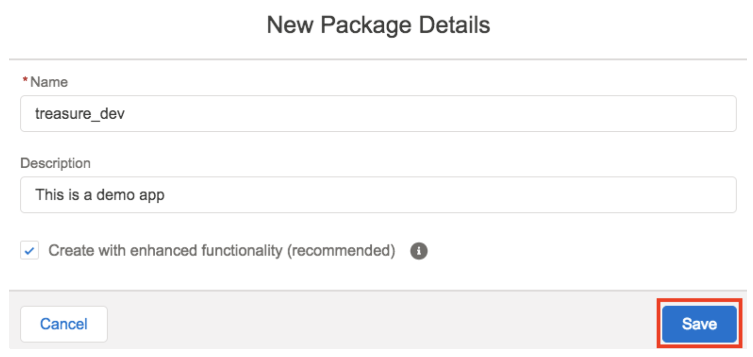 On the New Package Details pop up, enter the Name and Description and selectthecheckbox Create with enhanced functionality (recommended).
