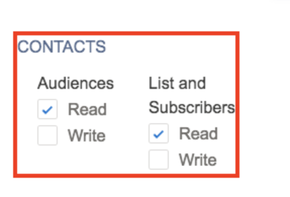 - Scroll to the CONTACT section and select the Read checkbox on Audiences and List and Subscribers