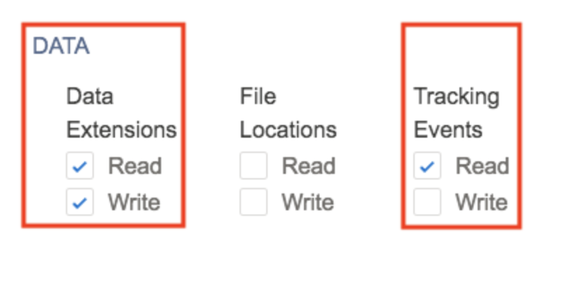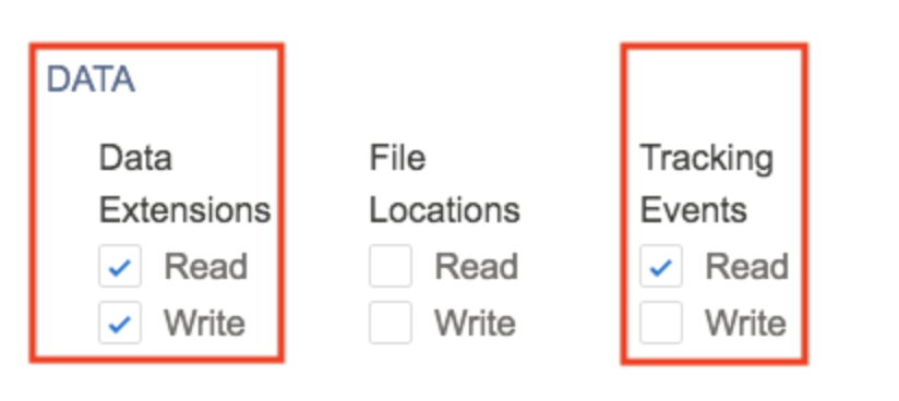 - Scroll to the DATA section and select the Read and Write checkbox on Data Extensions, Read for Tracking Events