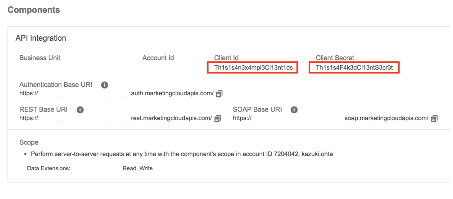 On the Installed Packages screen, scroll down to the Components panel, then take note of the Client Id and Client Secret. You use the information to write the data from Treasure Data to Salesforce Marketing Cloud.