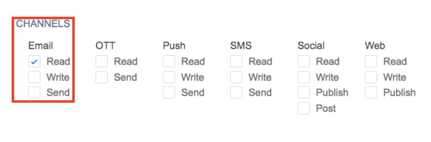 - Scroll to the CHANNELS section and select the Read checkbox on Email