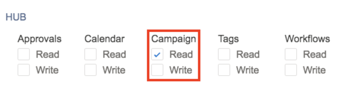 - Scroll to HUB section and select the Read checkbox on the Campaign