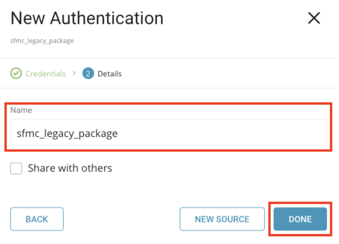 On the New Authentication screen, select Package Type as Legacy Package, then enter the Client Id and Client Secret (which you obtained when you created legacy package in SFMC).