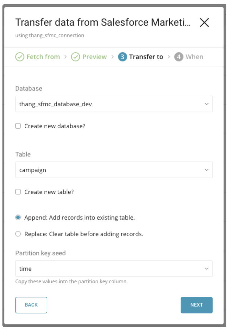 Select the database and table where you want to transfer the data: