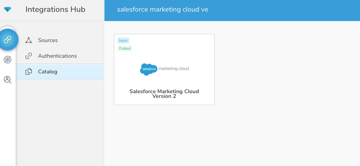 Go to Integrations Hub > Catalog and search and select Salesforce Marketing Cloud.