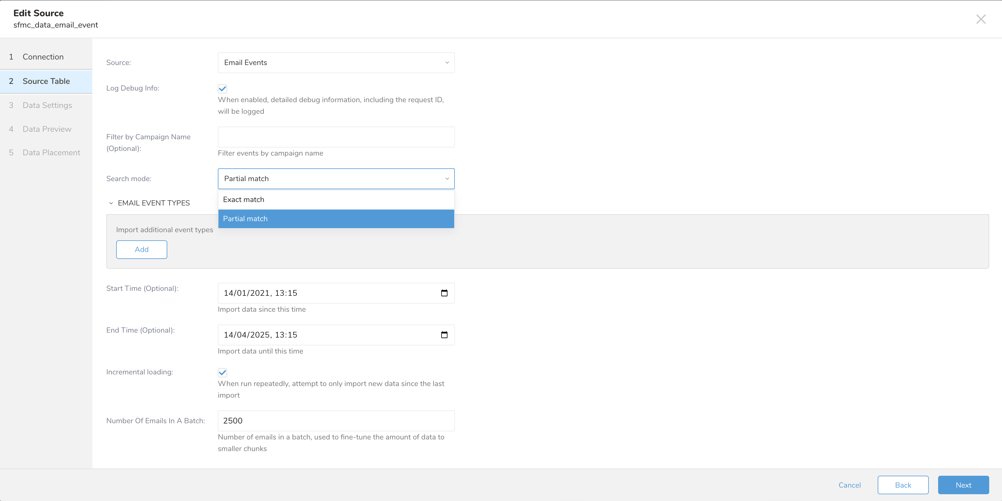 Email name matching pattern (exact or partial match): number of emails in a batch, used to fine-tune the amount of data to smaller chunk.