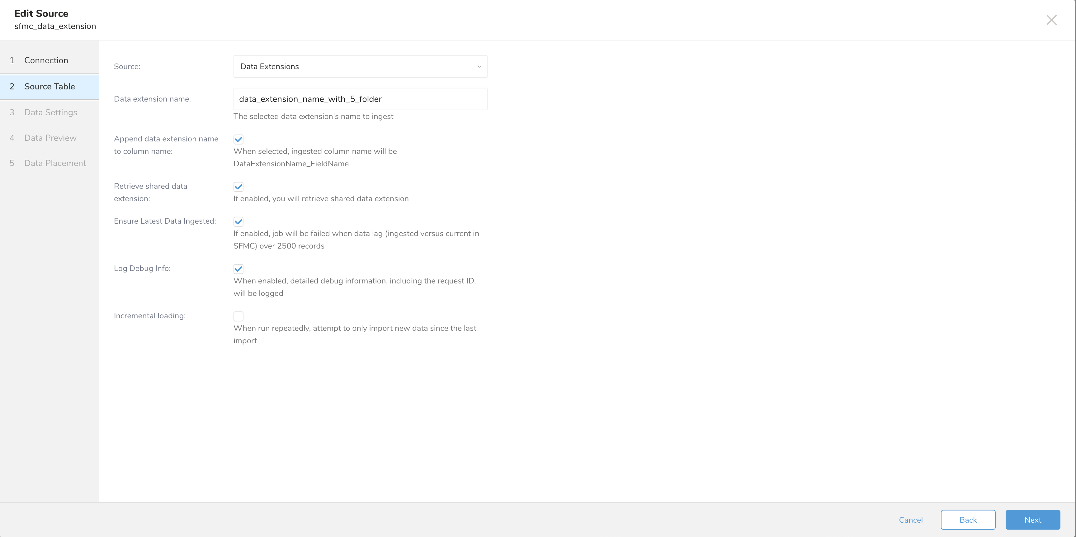 In some cases, your data breaks because some attributes are faulty. You can use the option Attribute set names will be ignored to skip faulty attributes. This option helps you ingest data from Salesforce Marketing Cloud’s API without error.