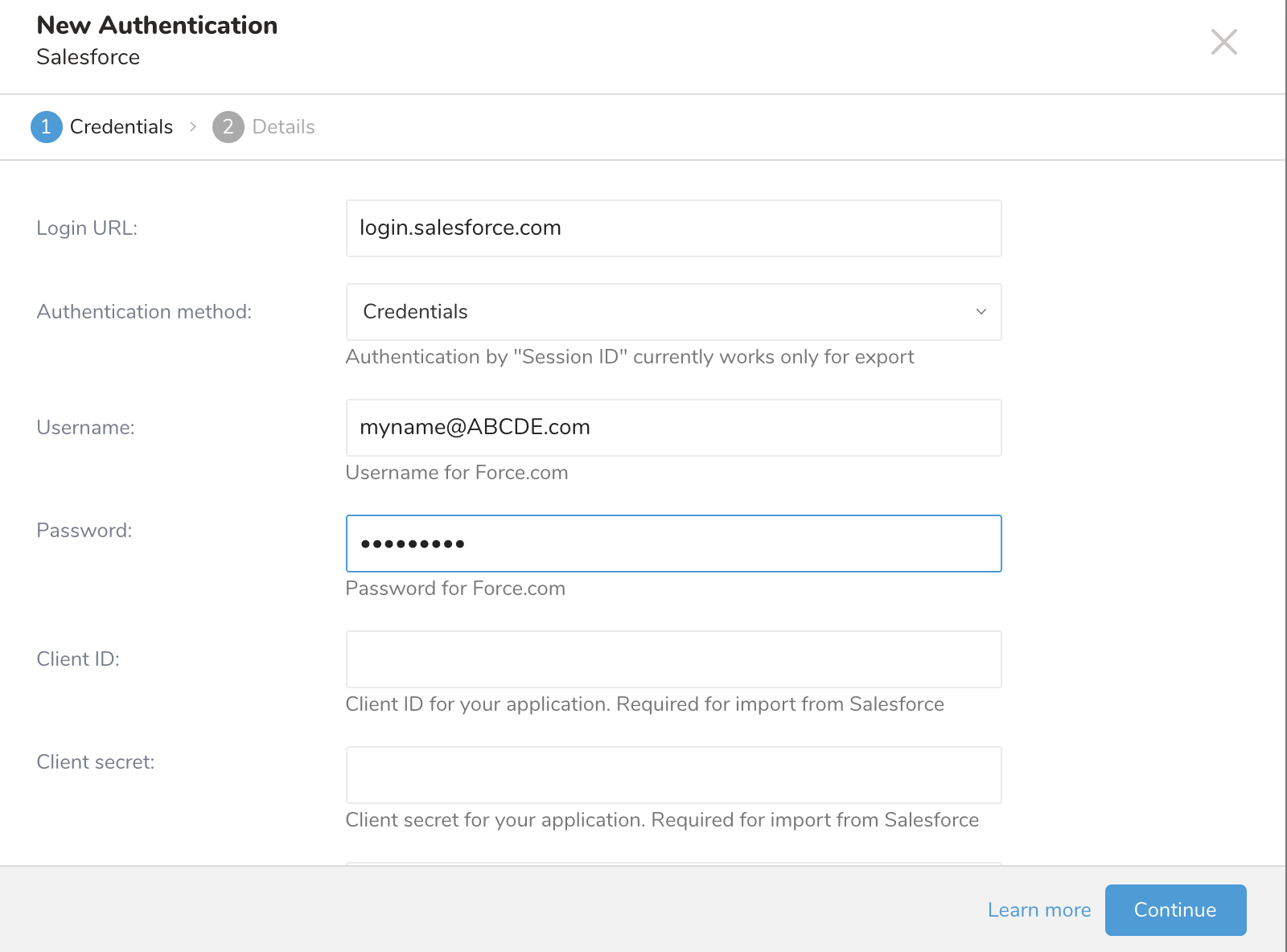 - To authenticate with your credentials, enter your username (your email) and password, your Client ID, Client Secret, and Security Token.