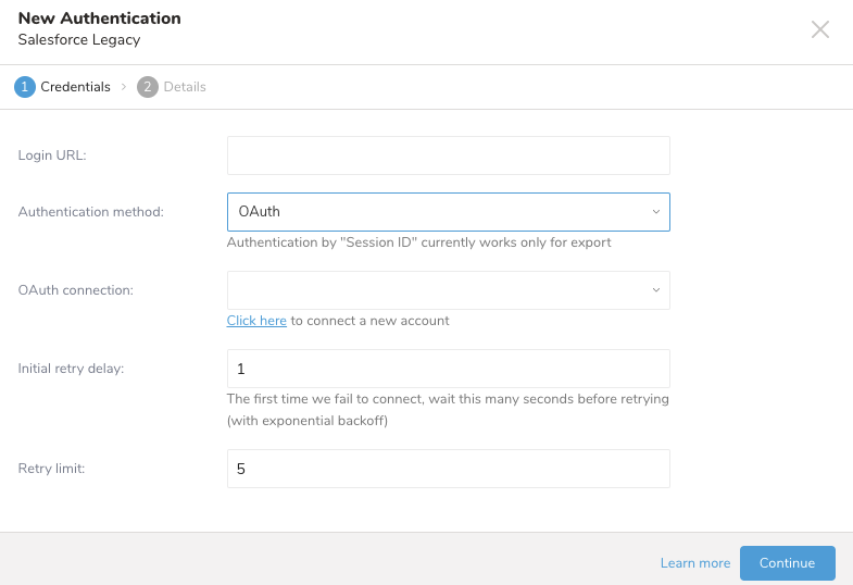 Connecting to Salesforce using the TD Console is quick and easy. Alternatively, create Salesforce connection using the command line. The import integration supports credentials; you need a client ID and client secret to authenticate using credentials.