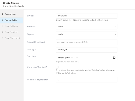| Start date | Defining the 'start_date' allows you to select only objects that have been created or updated since the 'start_date'. This field is dependent on the Incremental field. When incremental is set to false, created_at is considered the Start date target when you import from products, customers, transactions, orders object |