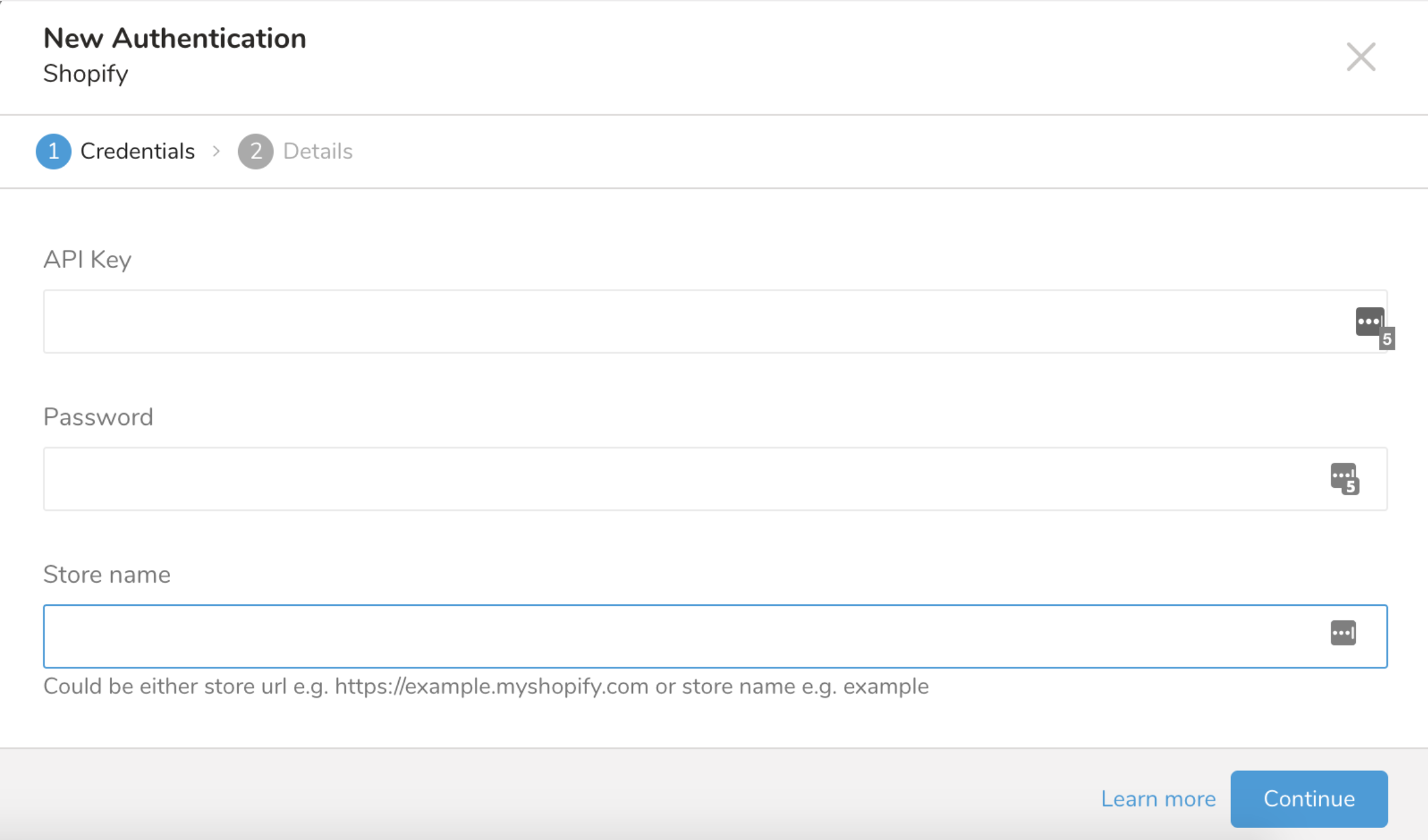 The following dialog opens. Check Admin API access token in Shopify console for Password value.
