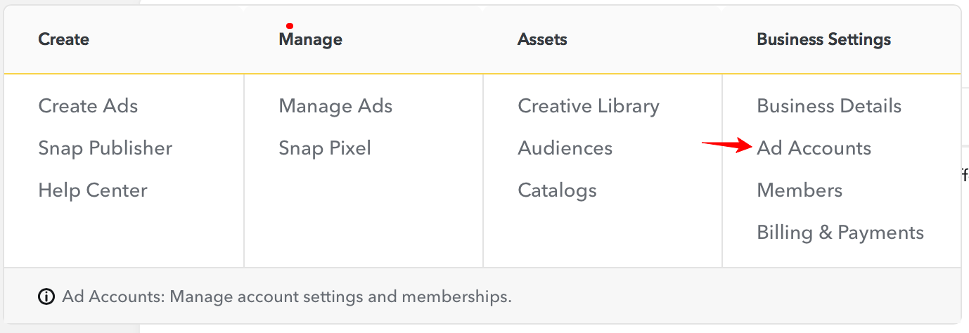 To find your Ad Account ID, log in to your Business account, and navigate to the Ad Account as shown in the following image. From there, you can see your Ad Account ID.
