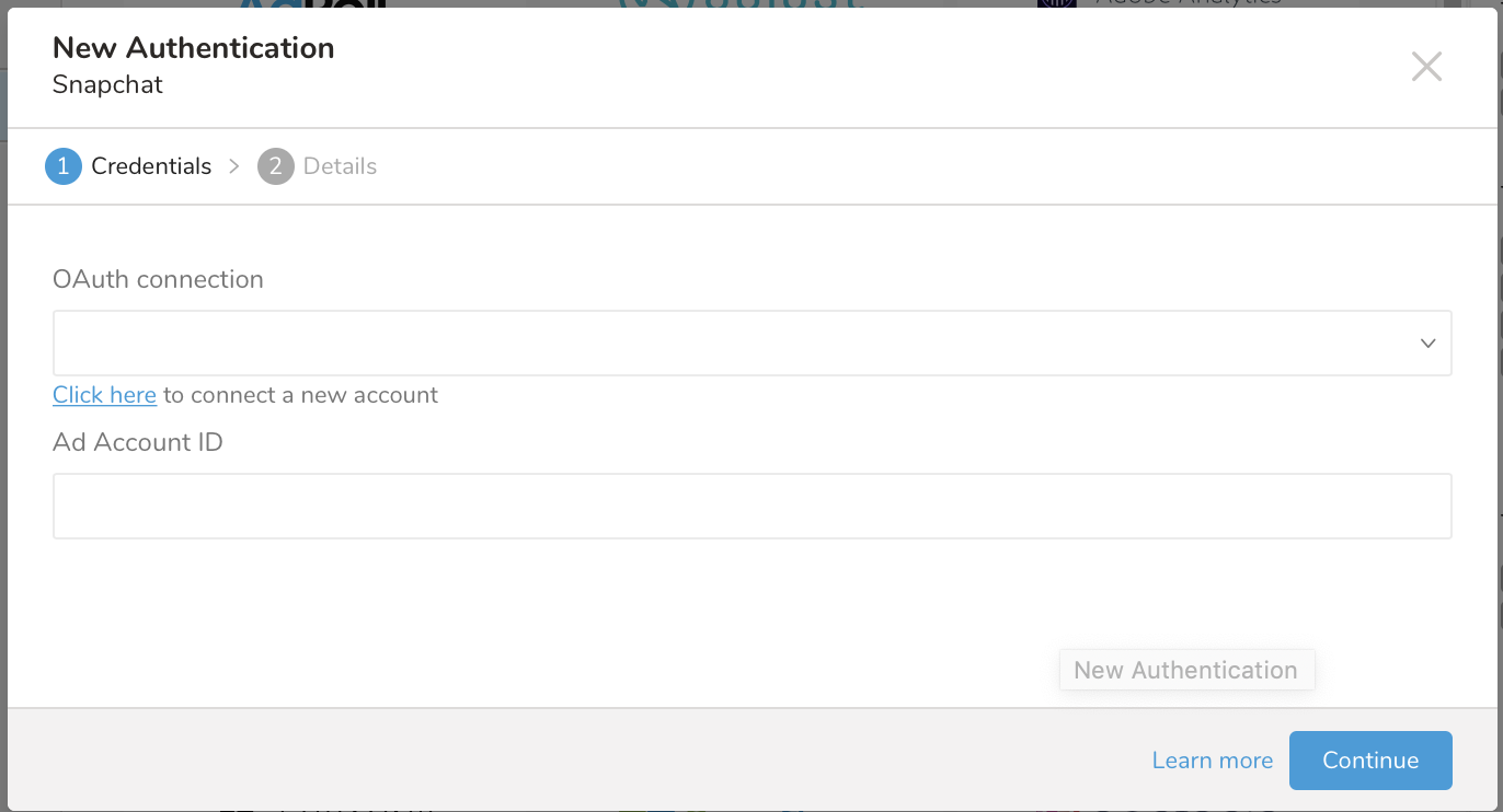 Create a new Snapchat Connection. Select New Integration, and select Snapchat from the Type dropdown. You see the following: