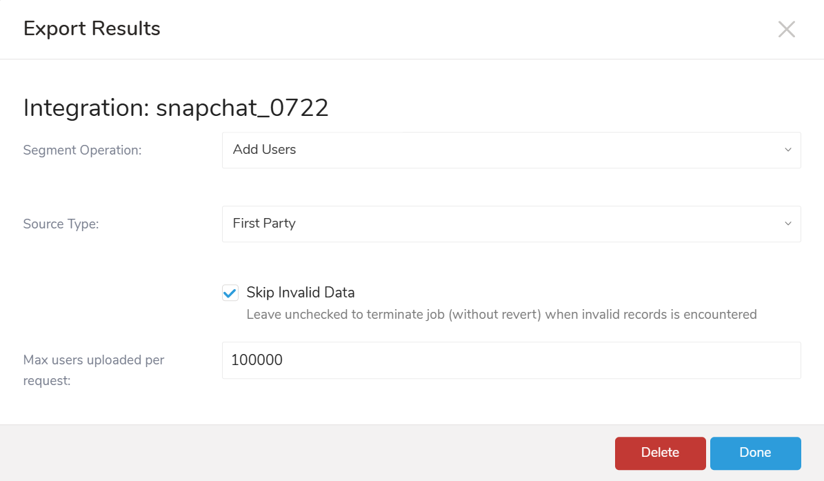 Max users uploaded per request (required): the maximum number of users uploaded in a single request. The default is 100000. Accepted value from 1-200000. If you specify more than 100000 users per request, you might receive an error message from Snapchat due to the limitation of uploaded users per request. The job splits the upload data into multiple requests based on this parameter. The query requests are processed until finished, and all data is uploaded.