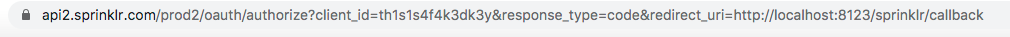 https://api2.sprinklr.com/{environment}/oauth/authorize?client_id={application_key}&response_type=code&redirect_uri={redirect_uri}For example, if the environment is prod2, the redirect URI is http://localhost:8123/sprinklr/callback, and the application key is th1s1s4f4k3dk3y, then the URL is as follows: