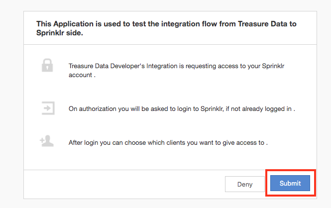 https://api2.sprinklr.com/prod2/oauth/authorize?client_id=th1s1s4f4k3dk3y&response_type=code&redirect_uri=http://localhost:8123/sprinklr/callbackIn your browser, you are asked for your approval to access your Sprinklr account. Select Submit.