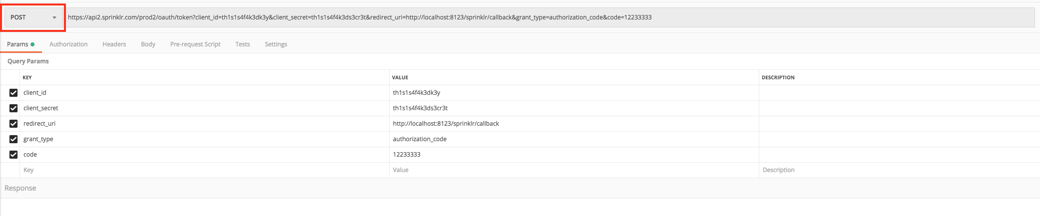 https://api2.sprinklr.com/prod2/oauth/token?client_id=th1s1s4f4k3dk3y&client_secret=th1s1s4f4k3ds3cr3t&redirect_uri=http://localhost:8123/sprinklr/callback&grant_type=authorization_code&code=12233333Change the method to POST.