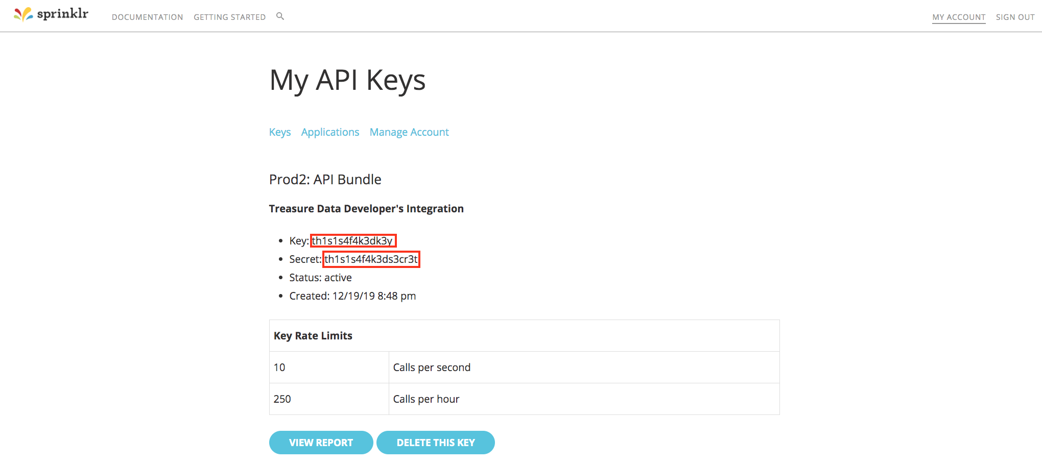 Next, go to https://developer.sprinklr.com/apps/mykeys to see your key (value 3 of 7 required for this configuration) and secret (value 4 of 7). Note the values. You use the information in later steps.