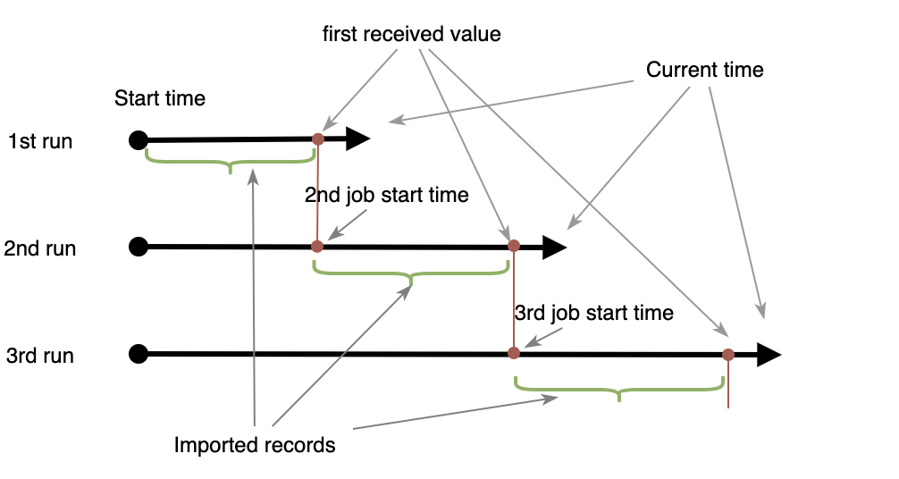 | Incremental loading | When running on schedule, the time window of the fetched data automatically shifts forward on each run. For example, if the initial configuration is January 1, with ten days in duration, then the first run fetches data modified from January 1 to January 10, the second run fetches from January 11 to the current time, and so on | No |