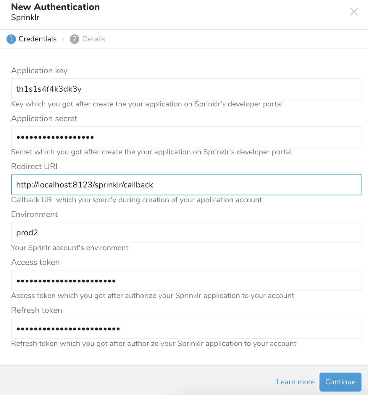 | Redirect URI (value 2) | http://localhost:8123/sprinklr/callback | redirect_uri | Redirect URI |