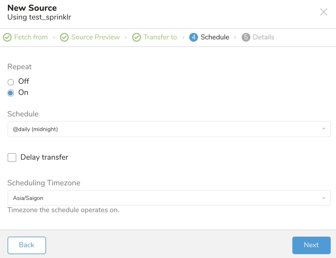 In the Schedule tab, you can specify a one-time transfer, or you can schedule an automated recurring transfer. If you select Once now, select Start Transfer. If you select Repeat… specify your schedule options, then select Schedule Transfer.