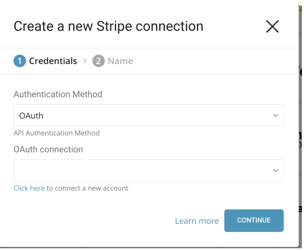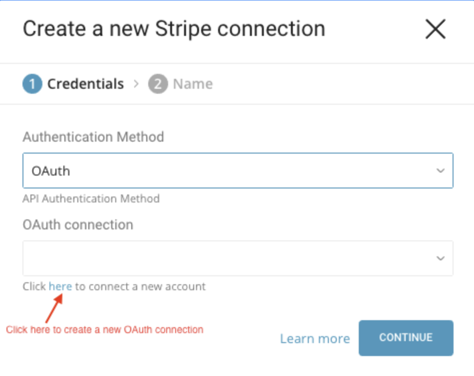 Select an existing OAuth connection for Stripe, or select the link under OAuth connection to create a new one.
